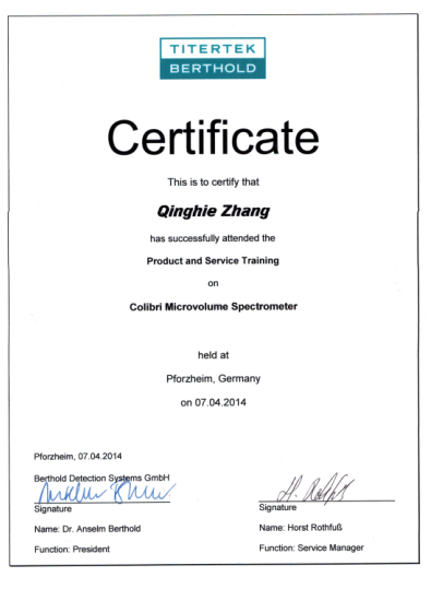 在4月份廣州市深華生物技術(shù)有限公司在總經(jīng)理張清杰的帶領(lǐng)下一行三人參加了第24屆Analytica 2014德國慕尼黑實驗室分析生化儀器展。在德國伯赫公司的工廠接受了產(chǎn)品培訓(xùn),(Titertek Berthold是一家擁有35年歷史的著名生命科學(xué)儀器制造廠商,是專注于樣品處理、自動工作站和樣品檢測的高科技公司,總部和研發(fā)生產(chǎn)基地設(shè)在美國Huntsville和德國Pforzheim),廣州深華公司也成功獲得德國伯赫Titertek Berthold產(chǎn)品售后培訓(xùn)資格證書。