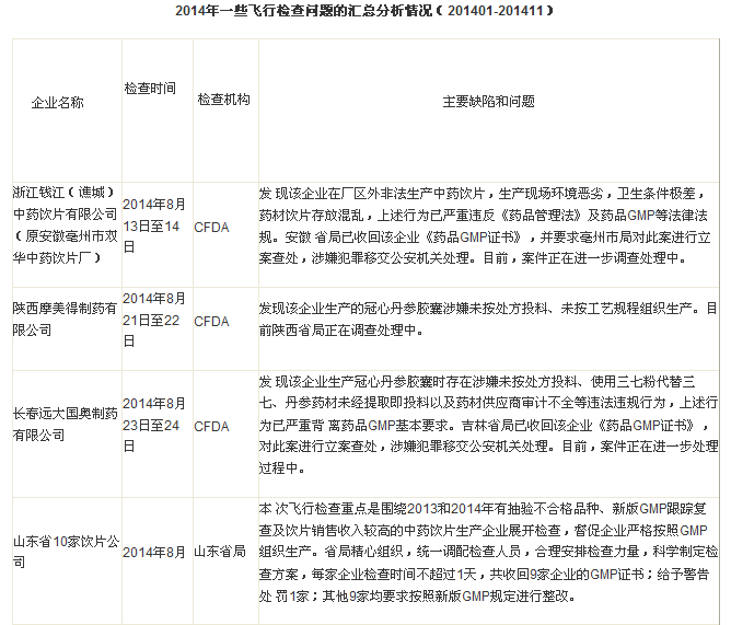進入11月份開始,CFDA的飛行檢查力度和密度更大,監(jiān)管趨勢更嚴厲。筆者根據CFDA網站和各省局網站公布的相關信息,匯總2014年度的飛行檢查情況如下:
