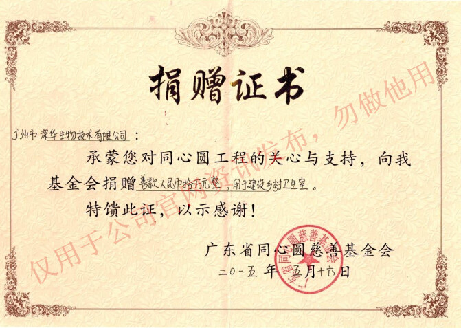 廣州市深華生物技術有限公司于2015年5月23日向廣東省同心圓慈善基金會捐贈善款人民幣十萬元整,用于建設鄉(xiāng)村衛(wèi)生室,改善鄉(xiāng)村醫(yī)療環(huán)境。給予了充分的關注與支持。
